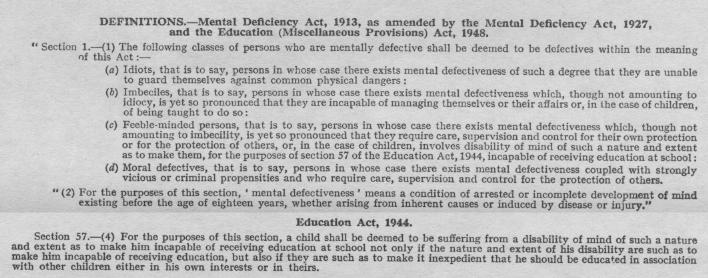 1913, 1927 and 1938 Mental Deficiency Acts, the 1944 Education Act and the
